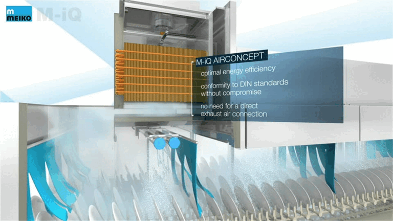 Proudy vzduchu osušovacího systému M-iQ jsou pomocí vyrovnávacích otvorů odděleny od mycí zóny. Výsledkem je mimořádně dobré schnutí, přičemž cenná energie je v každé provozní fázi optimálně zadržována v procesu. Zároveň se tím maximalizuje komfort obsluhy v místě odebírání nádobí.