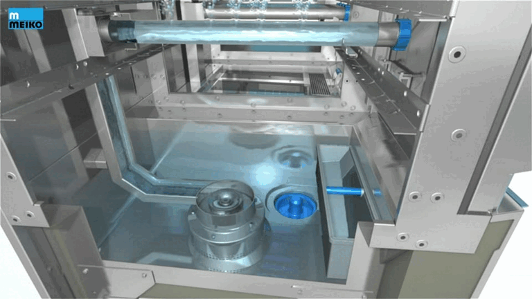 Zbytky jídel se zachytávají ve filtru a poté se aktivně, bez potřeby další vody, odstraňují pryč z nádrže – a tím i z mycího procesu.