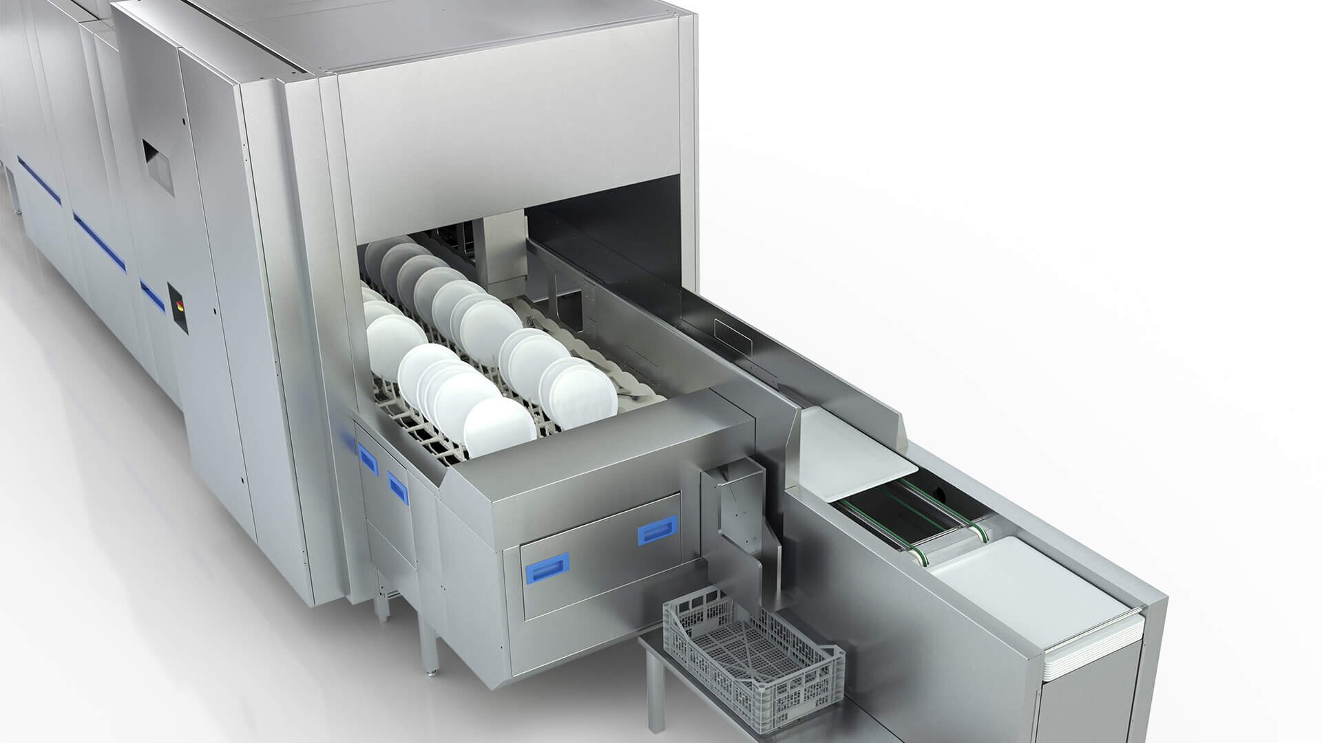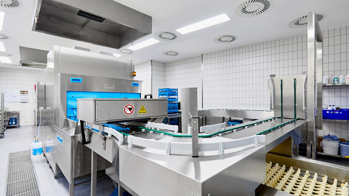 Zum höheren Automatisierungsgrad trägt die intelligente Besteck- und Tablett-Verarbeitung bei: Das Besteck wird entmagnetisiert gespült, für eine ideale Reinigung und Trocknung. Die Tabletts laufen platzsparend aufrecht durch die Maschine mit einer Kontaktzeit von über zwei Minuten.