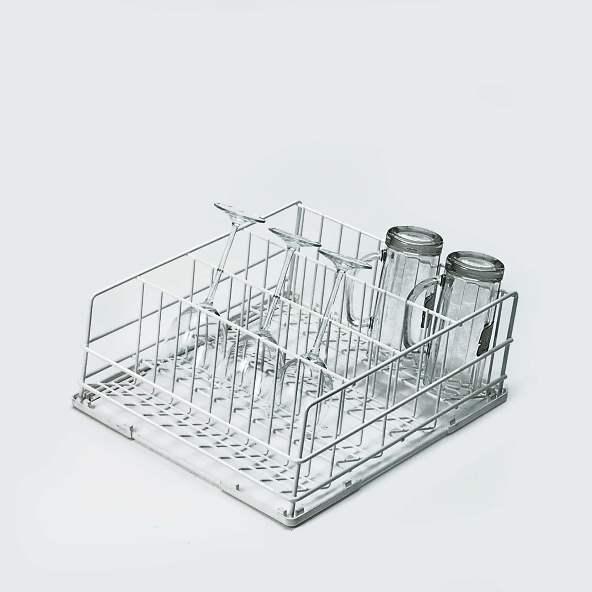 weiß, Polyamid-beschichtet, mit Schrägboden für Gläser bis 97 mm, Tassen, Untertassen, Teller bis Ø 200 mm, Korbhöhe 220 mm