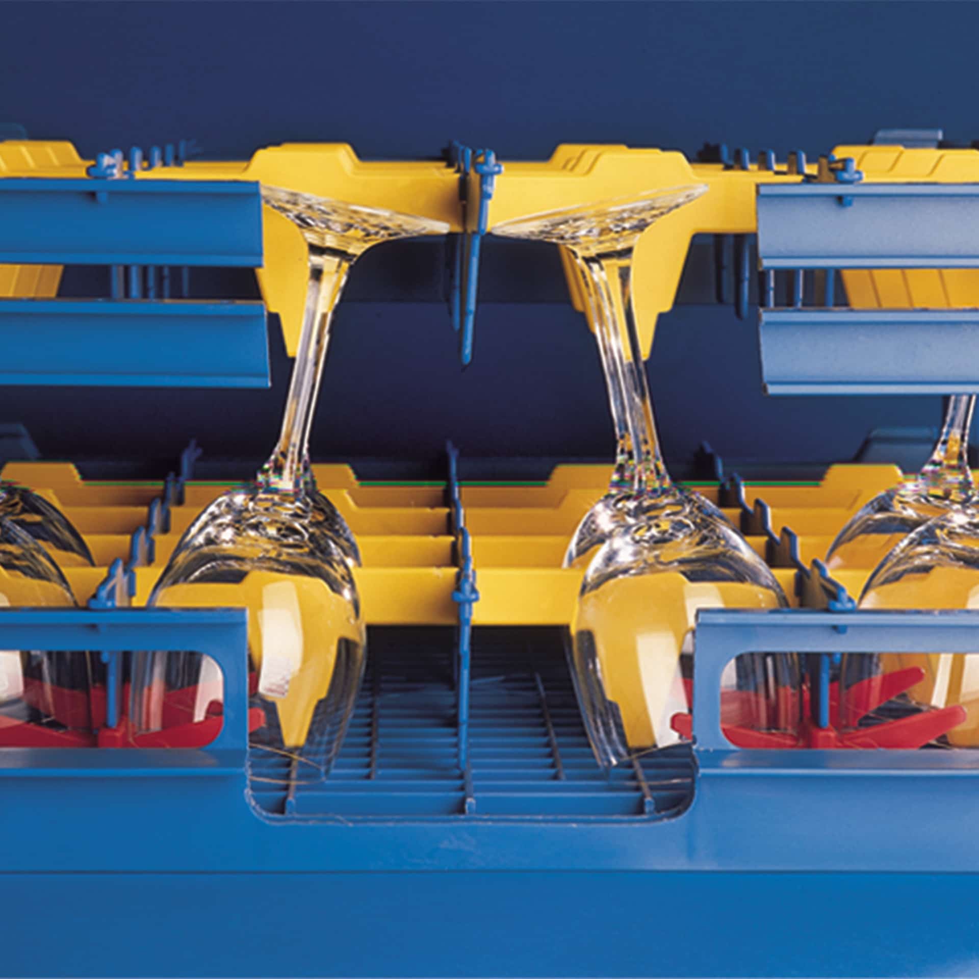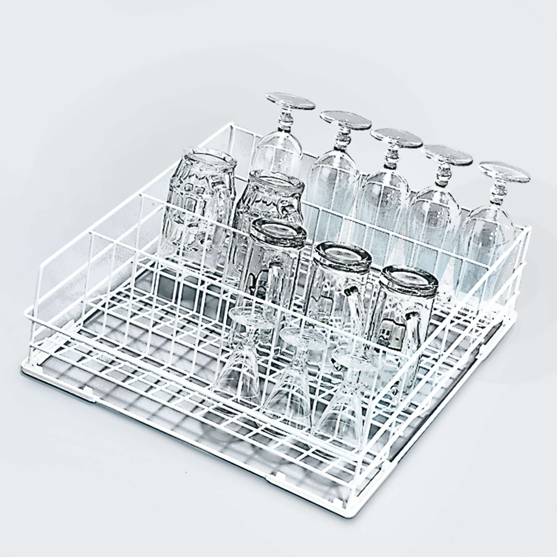 Auf Wunsch werden die Gläserkörbe mit Schrägstelleinsätzen ausgerüstet. Dies ermöglicht ein besseres Ablaufen des Wassers aus den Glasböden