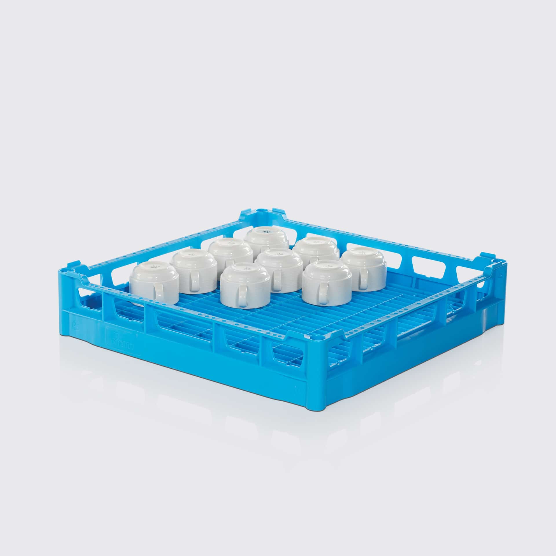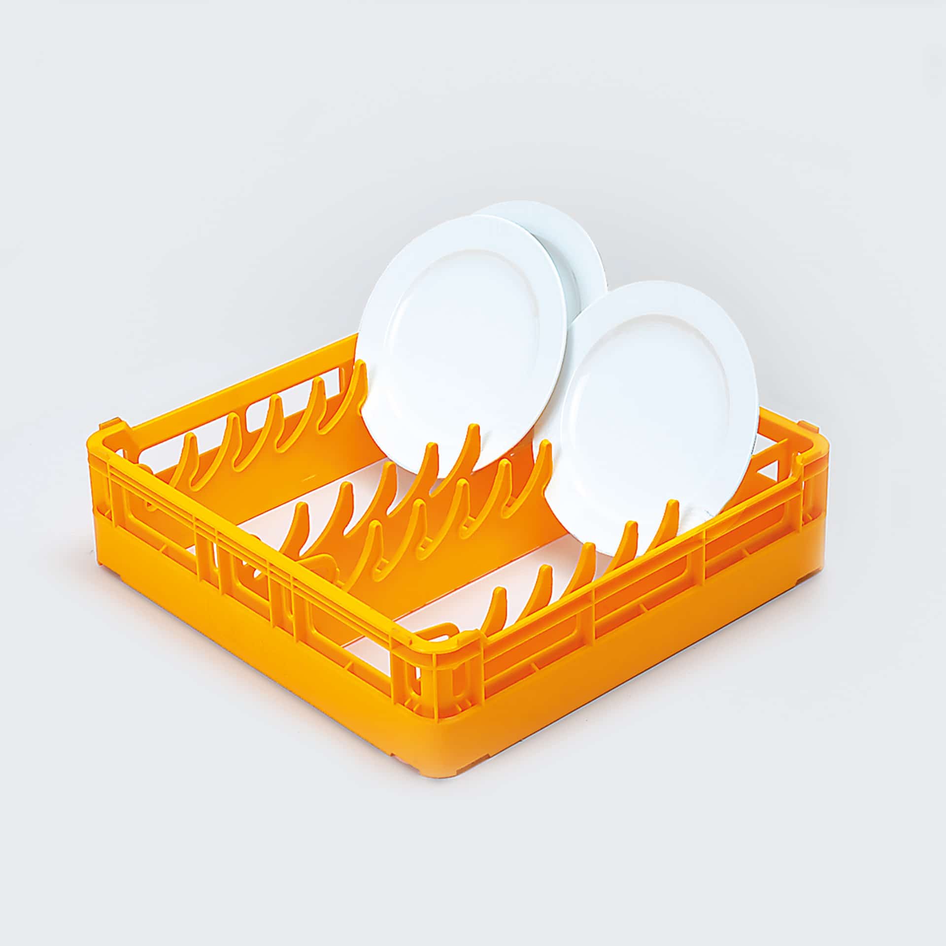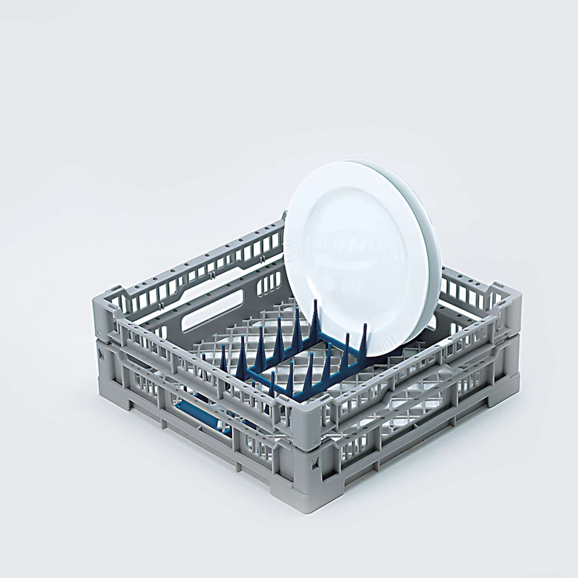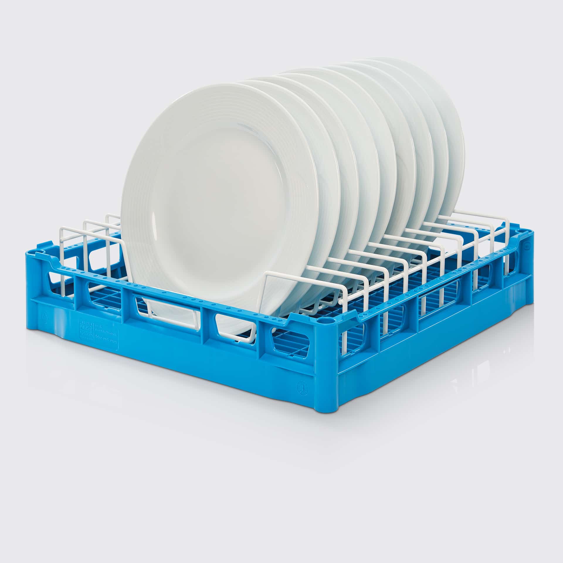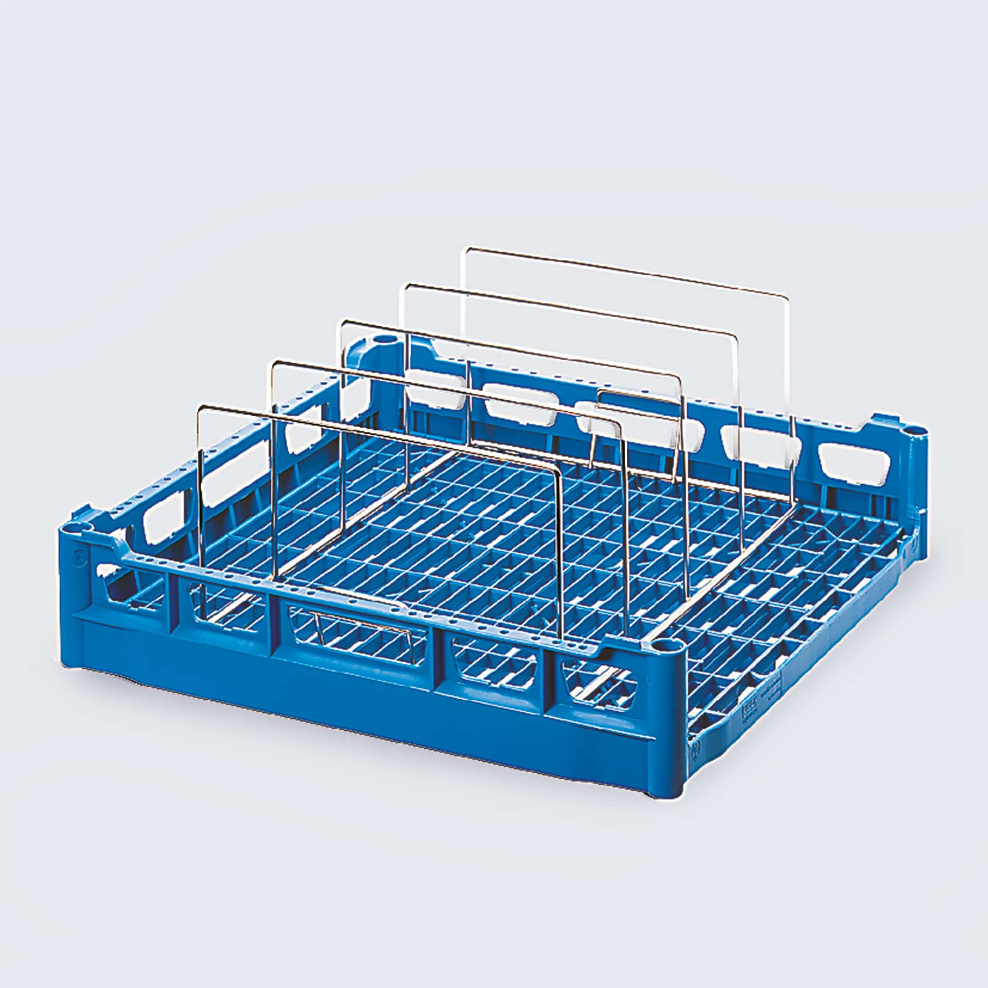 Die Universalkörbe haben zwei verschiedene Fingerabstände für die verschiedensten Tellertypen und -größen. Nasen an den Haltefingern und Kippsperren stabilisieren die Stellung vor allem größerer Geschirrteile und ermöglichen darüber hinaus eine spültechnisch optimale Schrägstellung des Waschgutes. Der Korbboden hat strömungsgünstig gestaltete Rippen, die den Spülwasserstrahlen eine optimale Durchlässigkeit bieten. Alle Kunststoffkörbe 500 x 500 mm lassen sich platzsparend aufeinanderstapeln und sind durch die Grifflöcher im Korbrahmen leicht und sicher zu greifen. Im 500er-Normmaß gibt es auch Körbe aus weiß, Polyamid- beschichtetem CrNi-Stahl für die unterschiedlichsten Waschgüter. Für den Einsatz in Korb- oder Bandtransportspülmaschinen sind eine Vielzahl der dargestellten Körbe ebenfalls einsetzbar.