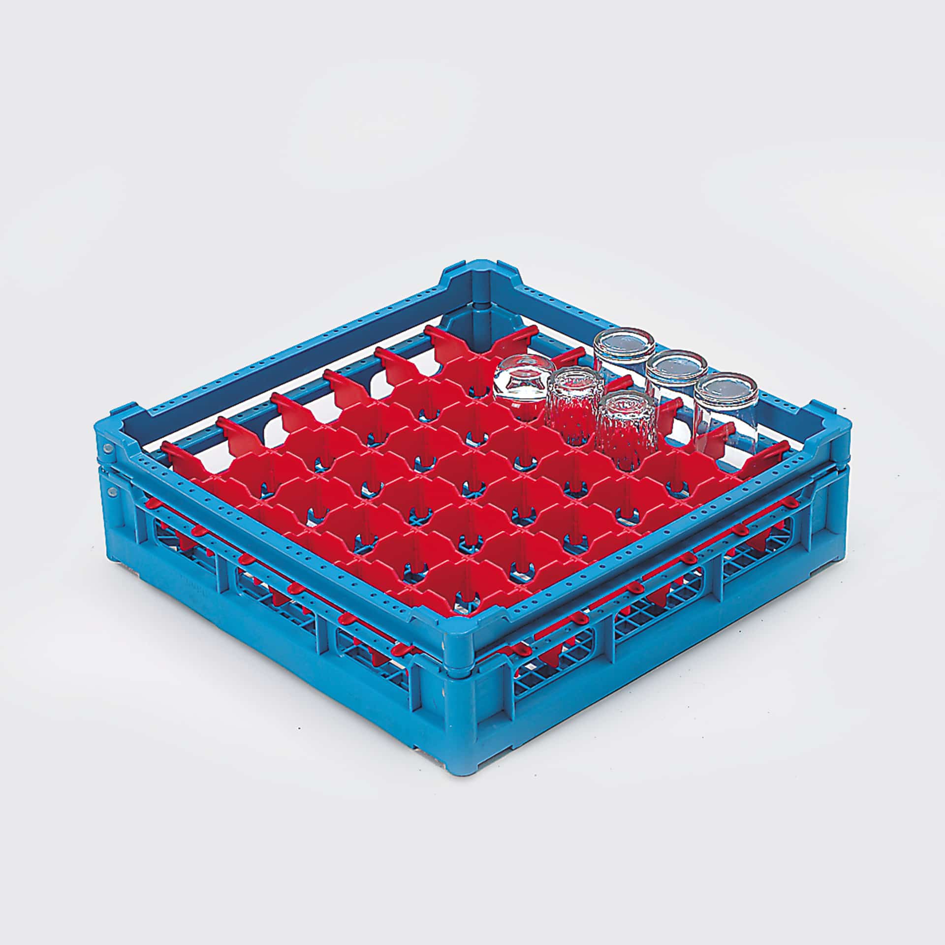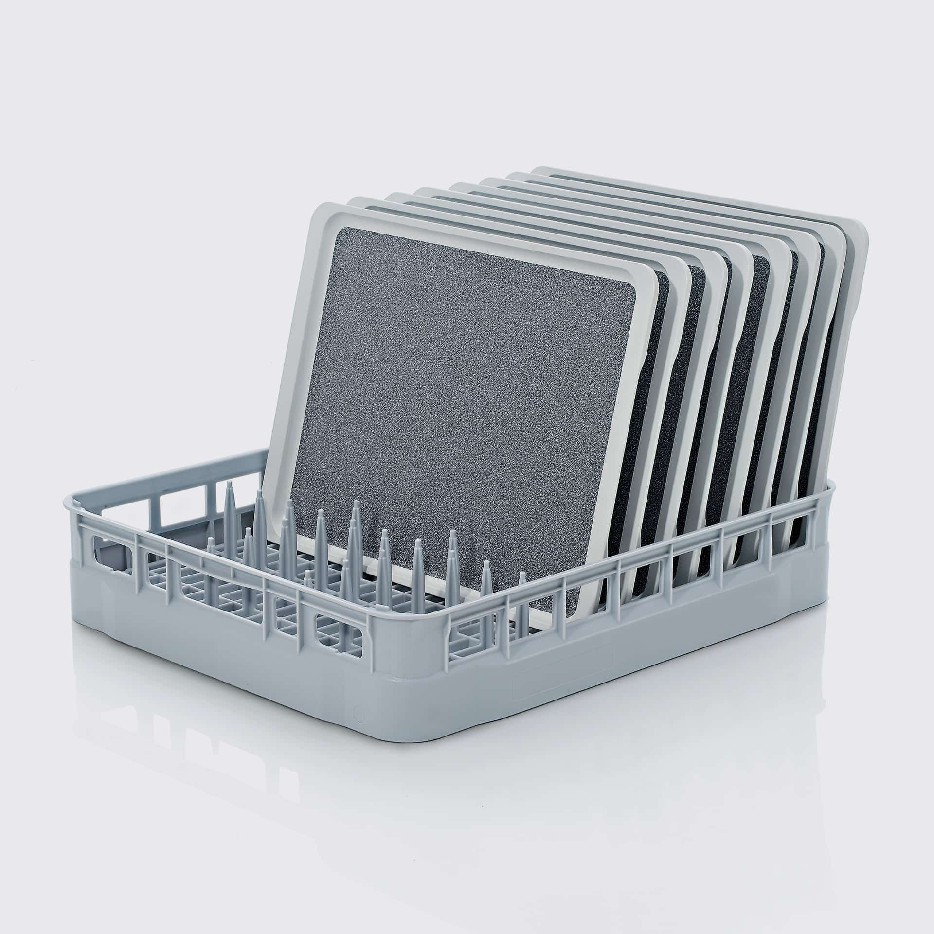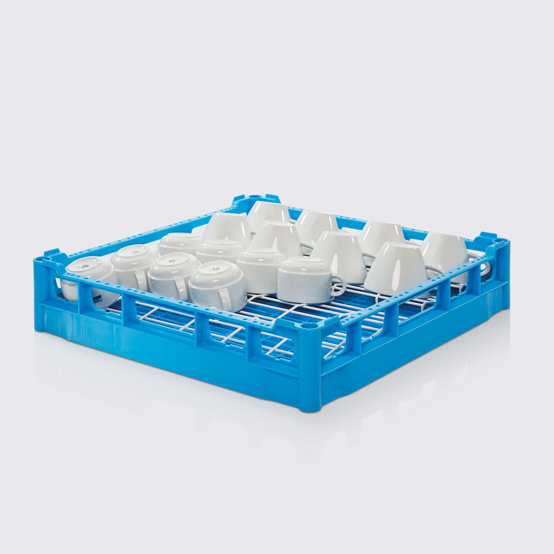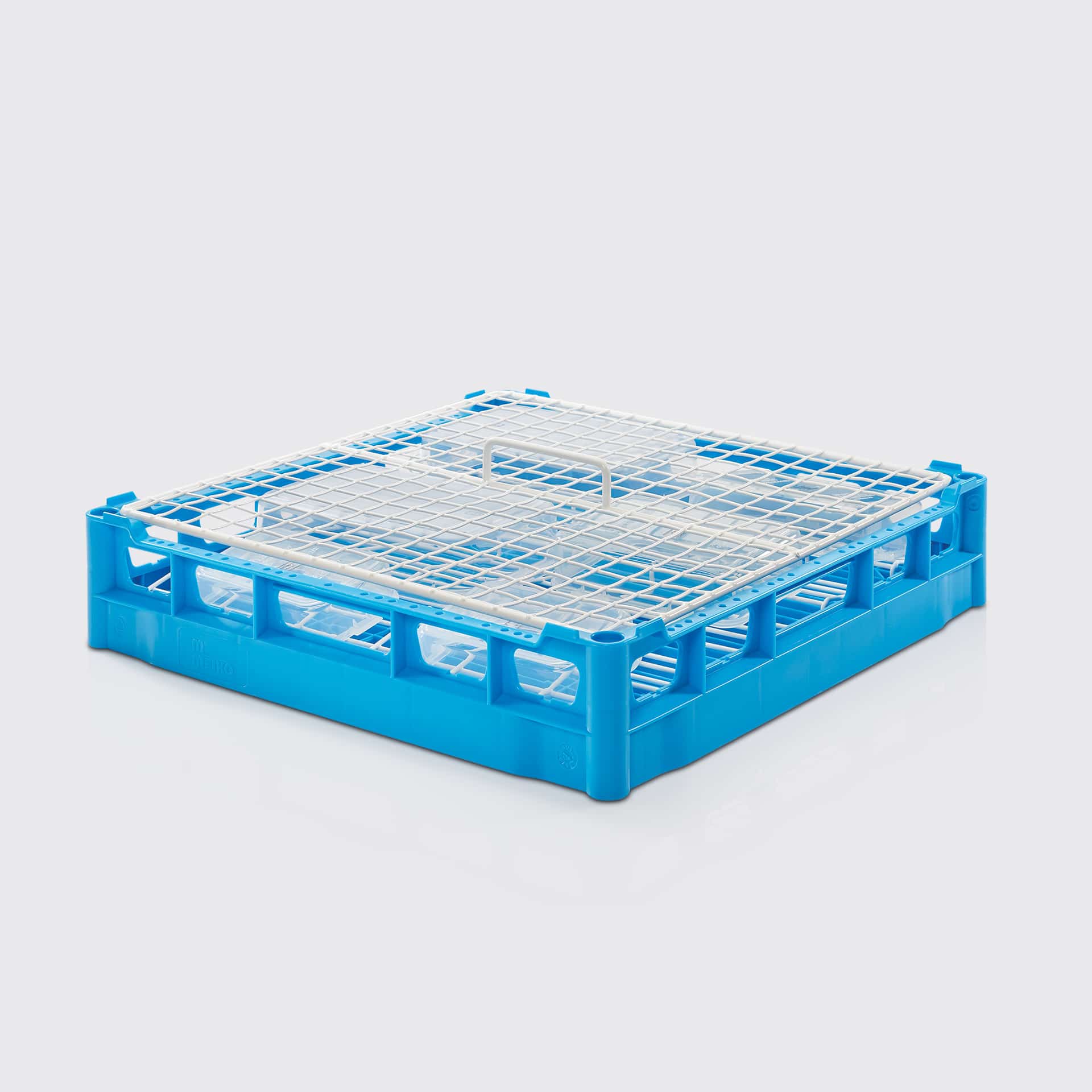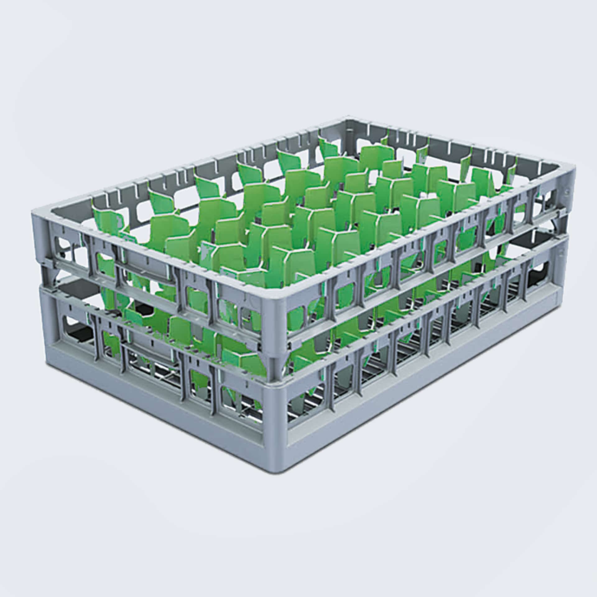 Die Universalkörbe haben zwei verschiedene Fingerabstände für die verschiedensten Tellertypen und -größen. Nasen an den Haltefingern und Kippsperren stabilisieren die Stellung vor allem größerer Geschirrteile und ermöglichen darüber hinaus eine spültechnisch optimale Schrägstellung des Waschgutes. Der Korbboden hat strömungsgünstig gestaltete Rippen, die den Spülwasserstrahlen eine optimale Durchlässigkeit bieten. Alle Kunststoffkörbe 500 x 500 mm lassen sich platzsparend aufeinanderstapeln und sind durch die Grifflöcher im Korbrahmen leicht und sicher zu greifen. Im 500er-Normmaß gibt es auch Körbe aus weiß, Polyamid- beschichtetem CrNi-Stahl für die unterschiedlichsten Waschgüter. Für den Einsatz in Korb- oder Bandtransportspülmaschinen sind eine Vielzahl der dargestellten Körbe ebenfalls einsetzbar.