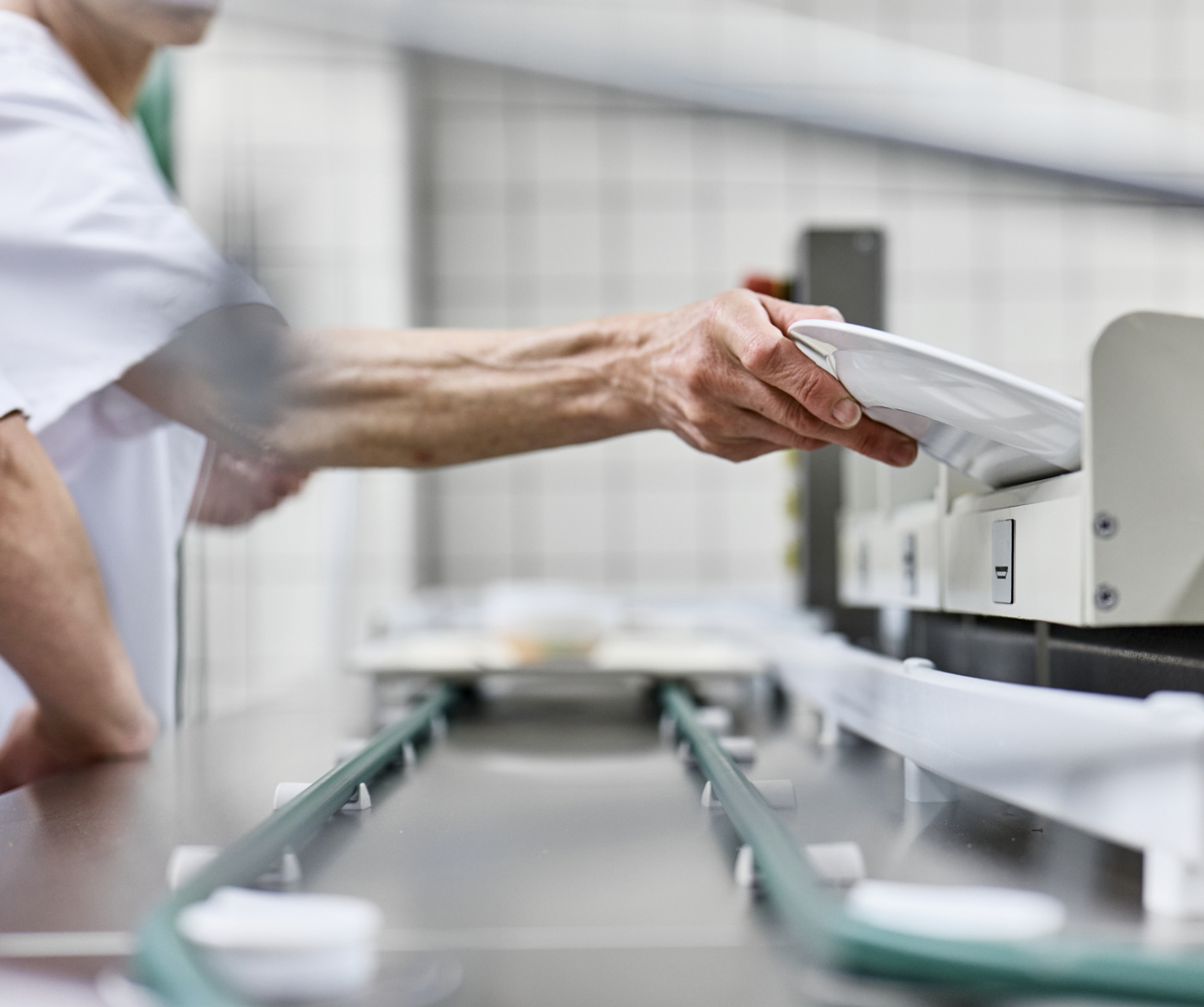 - Tabletts und Besteck werden automatisch weiterbefördert, gespült und gesammelt