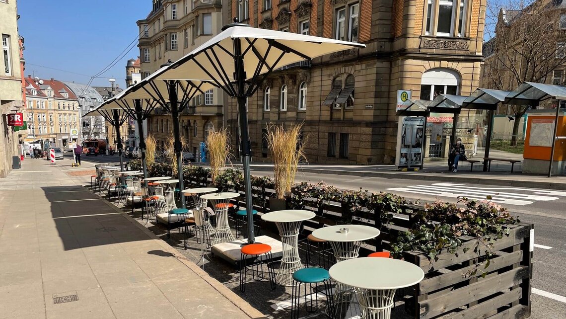 Im Winter kamen neue Tische, Stühle und Schirme für die Terrasse – die Heizstrahler waren schon da. Nun müssen nur noch die Straßenarbeiten vor der Bar abgeschlossen werden. Dann wird den Gästen auch auf der 16 Meter langen Terrasse der rote Teppich ausgerollt und der Outdoor-Betrieb kann starten.