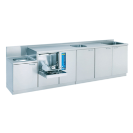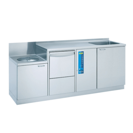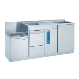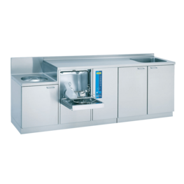 Wer im unreinen Pflegearbeitsraum mehr Platz hat, wird diese Pflegekombination schätzen: Steckbeckenspüler, Hygiene-Ausguss, Handwaschbecken mit Unterschrank und jede Menge Abstell- und Arbeitsfläche intelligent zusammengeführt. Auf nur 1,90 m Länge erhalten Sie eine Komplettanlage mit vielseitigsten Nutzungsmöglichkeiten.