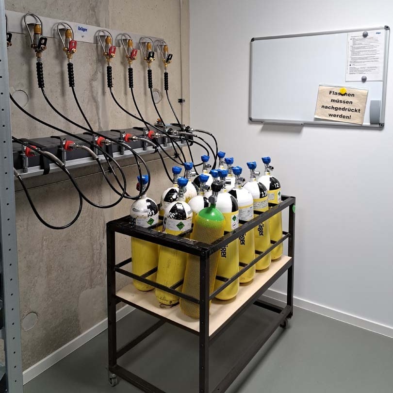Ebenfalls im Erdgeschoss befindet sich der Arbeitsplatz von Michael Weber. Er ist Leiter der Atemschutzwerkstatt der Feuerwehr Hürth und im erweiterten Alarmdienst tätig. Auf 144 m² bereiten er und seine Kollegen die Ausrüstung ihrer Kameradinnen und Kameraden auf. 26 Chemikalienschutzanzüge, über 100 Atemschutzgeräte sowie fast 300 Atemschutzmasken und noch einmal so viele Flaschen befinden sich im Pool der Feuerwehr Hürth. Die Räumlichkeiten bieten einen modernen Schwarz- und Weißbereich mit optimierten Arbeitswegen und neuester Technik. Zehn Kollegen arbeiten hier, die meisten im 24-Stunden-Dienst. Sie alle schätzen die neue Infrastruktur und die verbesserten Arbeitsbedingungen. Mit einem guten Gefühl zur Arbeit kommen und zufrieden heimgehen – die neue Atemschutzwerkstatt bringt viele Vorteile mit sich.