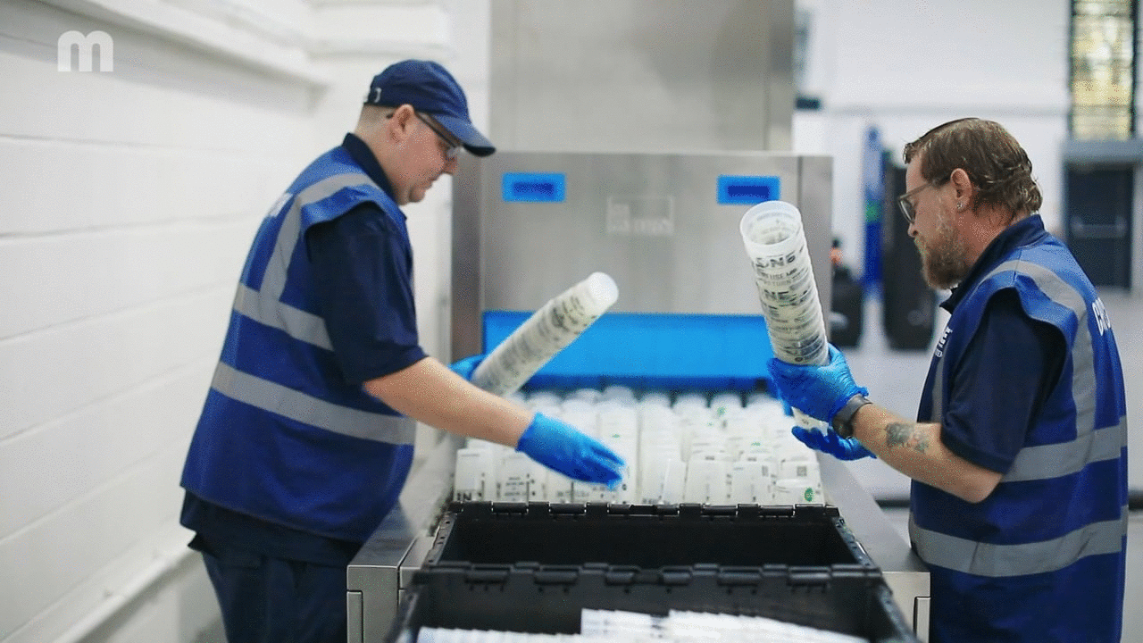 Mehrwegbecher verlassen die M-iQ Gewerbespülmaschine