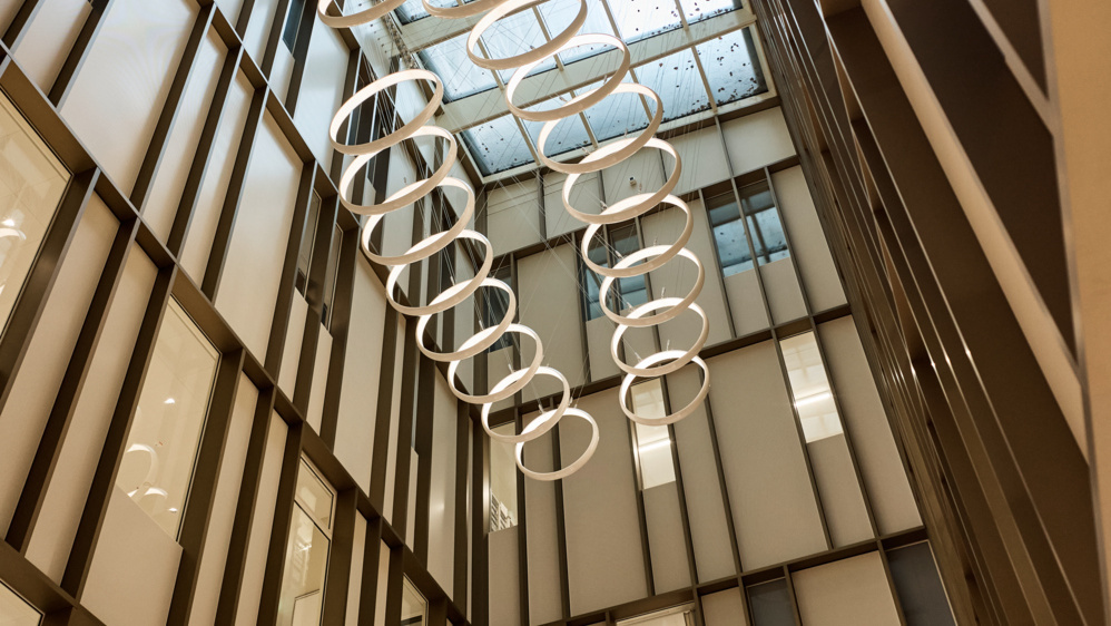 Whether nervously awaiting a diagnosis, hurrying to a nightshift or counting down the minutes to visiting time, the sight that greets you as you enter the atrium of the Anna-Seiler-Haus is almost guaranteed to make you pause. Suspended at a height of 21 metres, 24 rings are engaged in an almost hypnotic dance. No two moments are exactly alike, yet the overall effect is one of harmony.