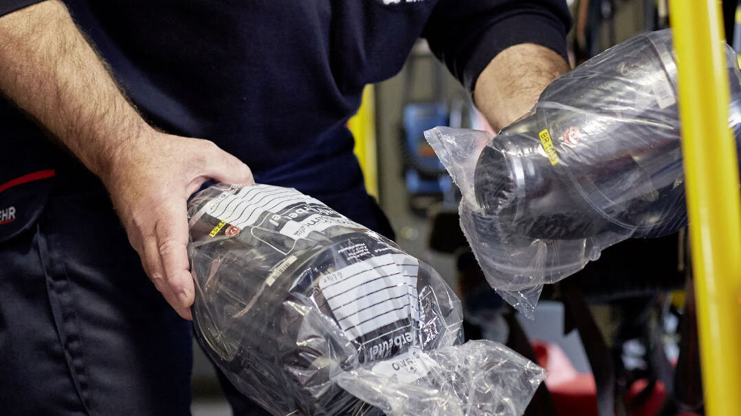 Five full-time firefighters are responsible for managing the equipment and ensuring it is safe and ready for use. The Bruchsal Volunteer Fire Department's BA cleaning facility exclusively cleans and disinfects the breathing gear required by its own firefighters, namely 200 masks from the manufacturers Interspiro and Auer.