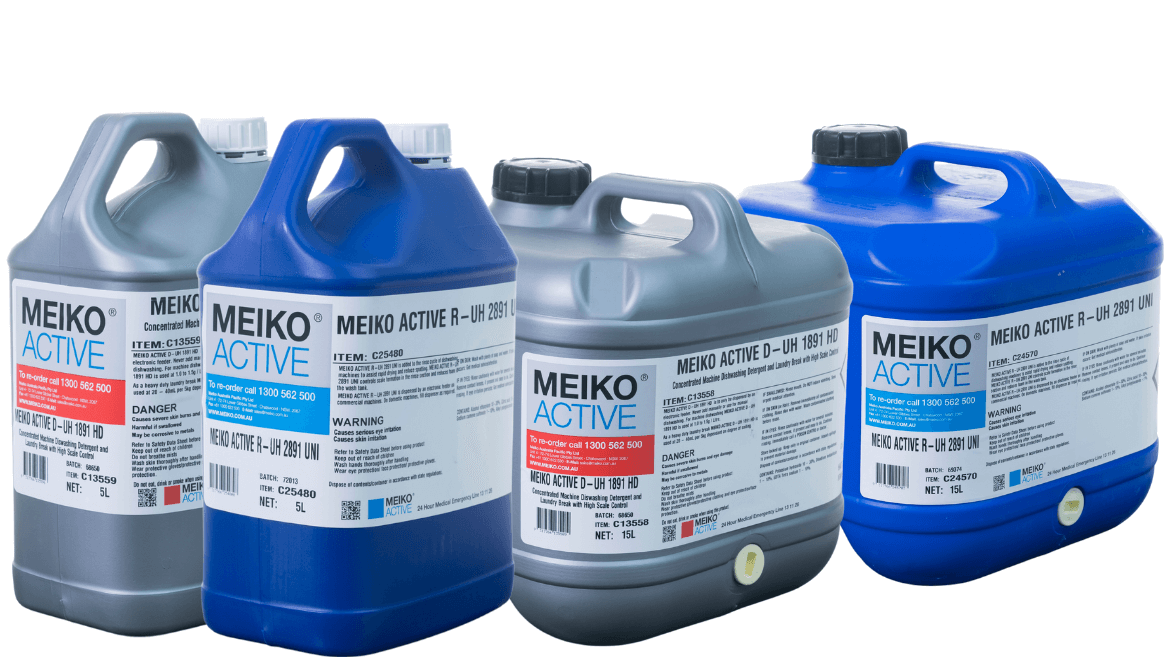 We've got chemistry! But MEIKO wants to use the minimum quantities of chemicals possible to still achieve reliable, hygienic washing results. This requires the perfect interplay of machine, water quality and chemical products. The chemical products in the MEIKO ACTIVE range offer excellent performance.