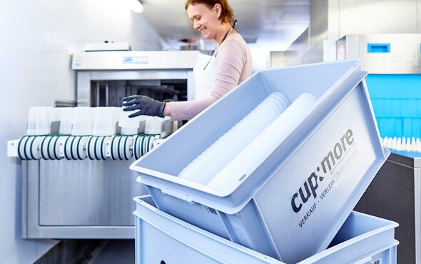- Returnable cups are rinsed and dried in an industrial dishwasher