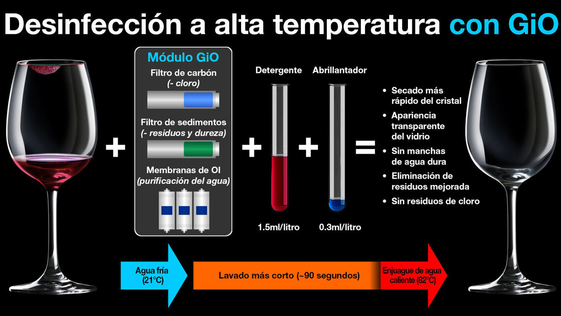 El sistema GiO (Lavado de Cristal con Ósmosis Interna) es la solución integral de MEIKO para el tratamiento de agua con ósmosis inversa. Este proceso consiste en la eliminación total de minerales y sales solubles en agua dura a través de un sistema de filtración por membrana que retiene casi todas las sustancias innecesarias, permitiendo el uso de agua pura tanto en el lavado como en el enjuague. El ciclo termina con un enjuague de agua caliente que deja todos los artículos brillantes, evitando la necesidad de pulirlos a mano a posteriori.