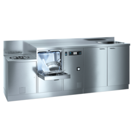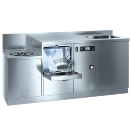 Le plus compact des combinés de soins MEIKO est la solution idéale si vous disposez de peu de place.  Il dispose d'un vaste plan de travail et offre une grande liberté de mouvement au personnel pour effectuer ses différentes tâches dans le local vidoir, si exigu soit-il.