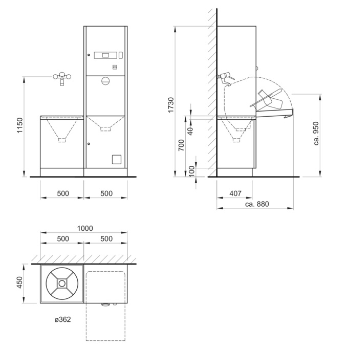Ce combiné de soins comprend non seulement un lave-bassins, un vidoir, un grand évier, un placard bas (600 x 600 x 860 mm) et un plan de travail, mais aussi un lave-mains. Il offre de nombreuses possibilités dans le local vidoir. Parfaitement ergonomique, il garantit de bonnes conditions de travail en plus d'une grande sécurité sanitaire.