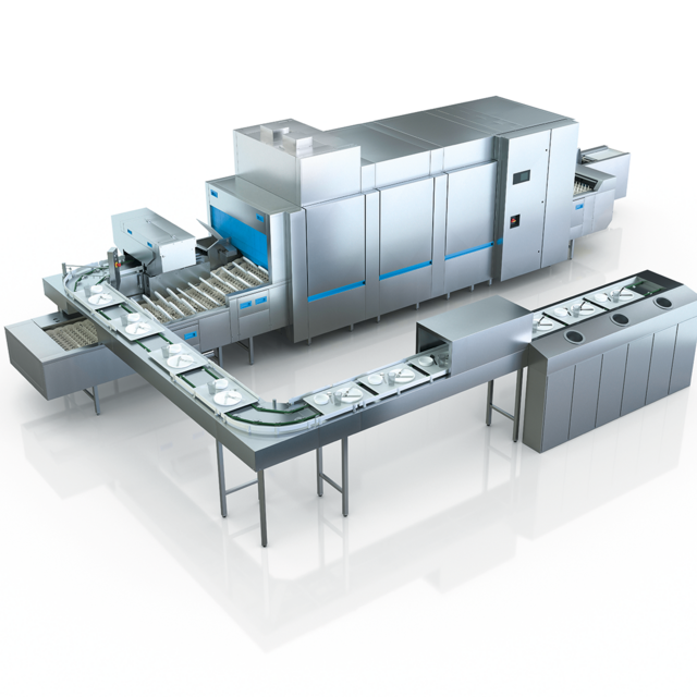 Nell'infrastruttura del primo e del secondo piano sono presenti lavastoviglie a nastro MEIKO B690VAP-CSS-Top con convogliatore bi-corda e disidratatore dei rifiuti AZP 80 con canale di scarico, per una capacità di lavaggio di fino a 7.000 piatti l'ora. I rifiuti vengono smaltiti nel canale di scarico che alimenta l'AZP. L'AZP riduce il volume dei rifiuti fino all'80%, creando così un risparmio notevole in termini di manodopera, trasporto e immagazzinamento. Le infrastrutture del terzo e del quarto piano utilizzano lavastoviglie a nastro MEIKO B190P con una resa fino a 2.000 piatti l'ora.