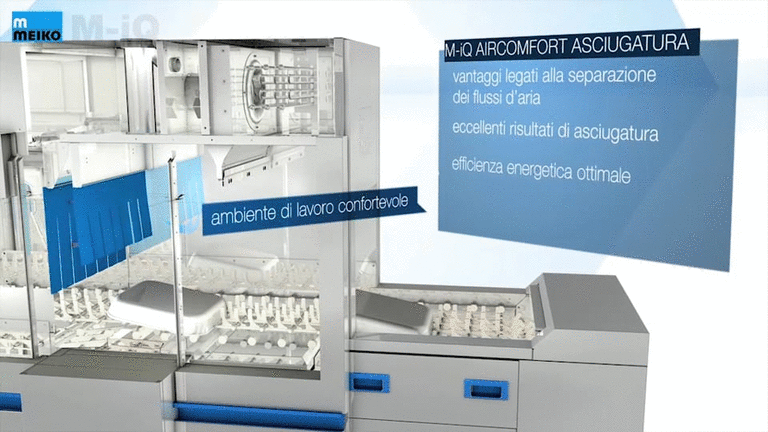 I flussi d'aria dell'asciugatura M-iQ vengono separati dall'area di lavaggio attraverso aperture di compensazione. Il risultato di asciugatura è eccellente, mentre in ogni fase del processo viene conservata preziosa energia. Al tempo stesso l'operatore nella postazione di prelievo lavora in totale comfort.