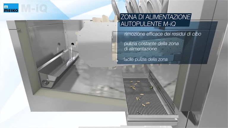 Un lavoro pulito inizia dall'alimentazione della macchina: i residui di cibo vengono eliminati automaticamente da un potente getto d'acqua. Come un'enorme cascata di acqua pura.
