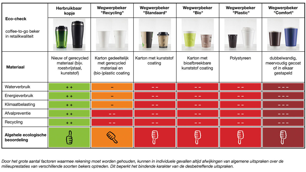 Het even snel genieten van een kopje koffie betekent bovendien een verbruik van grondstoffen (voor de bekers) van 1,5 miljard liter water en 43.000 bomen (64.000 ton hout) voor 29.000 ton papier – per jaar. Alleen in de hoofdstad Berlijn worden elk jaar 170 miljoen coffee-to-go-bekers verbruikt. Met de energie die nodig is voor de productie ervan, zouden ongeveer 6.100 huishoudens een jaar lang voorzien kunnen worden van stroom en kan ongeveer 87 miljoen liter water worden bespaard.