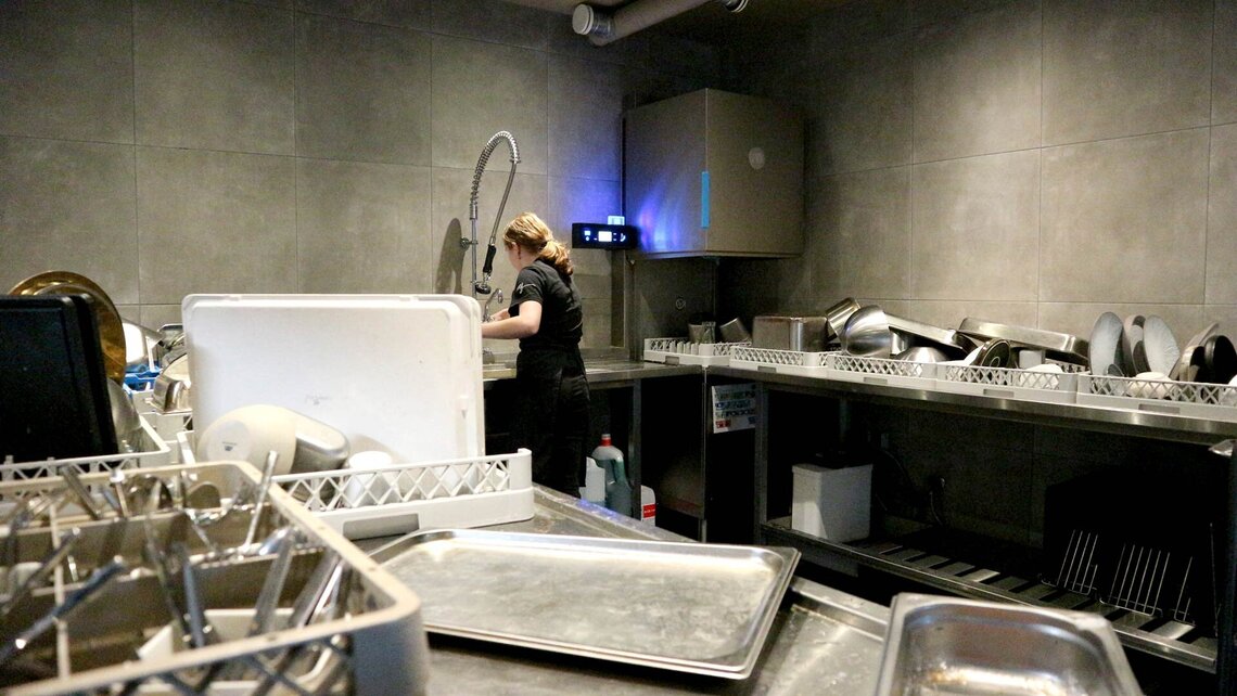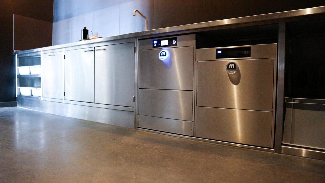 De spoelstraat beneden is een ruimte van maar liefst 7 meter met veel afzetruimte en twee MEIKO M-iClean UM voorladers; een glazenspoeler met osmose en warmteterugwinning voor glazen, en een vaatwasmachine zonder osmose voor porselein. “Die warmteterugwinning van MEIKO is echt ideaal voor ons. De glazen zijn sneller droog en we hoeven niet te poleren. De glazen zijn daardoor weer snel inzetbaar en dat is heel belangrijk in de horeca”.