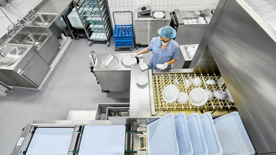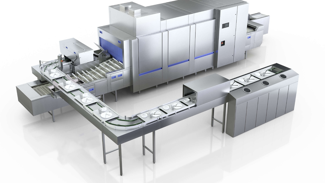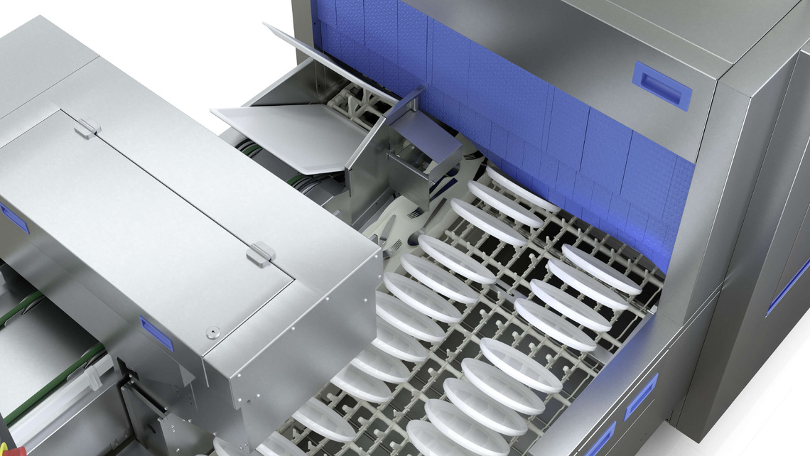 Makine ayrıca yüksek düzeyde otomasyon da sunuyor: Tepsiler ve çatal-bıçaklar otomatik olarak yükleniyor (dakikada 25 tepsi). Tabaklar ise son derece geniş tasarlanmış bulaşık hattına en ergonomik koşullar altında elle yerleştiriliyor.